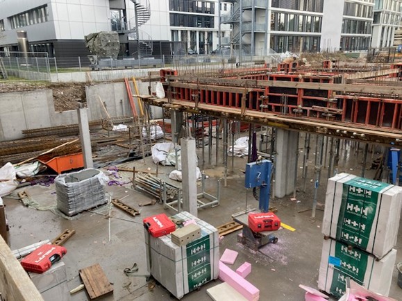 Stützen und Außenwände der Tiefgarage sind fertig, Unterzüge werden hergestellt. (20.2.26)