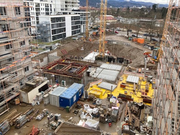 Haus 9 – Blick von Haus 6 auf unsere Baustelle. Tiefgaragen- und Kellerdecke werden geschalt. (20.2.26)